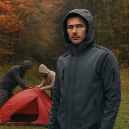 Wetterfeste Softshelljacke mit winddichtem Material, warmer Fütterung, Brusttasche, verstellbarer Kapuze und ergonomischem Schnitt – ideal bei Schnee, Wind und wechselhaftem Wetter.