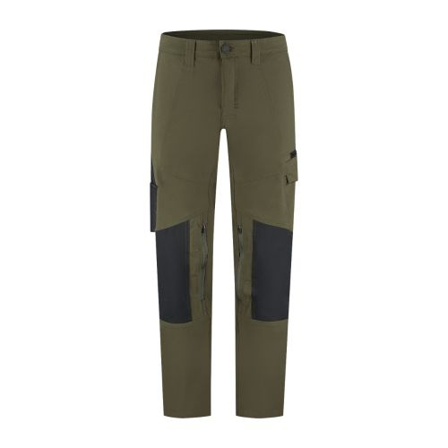 Praktische Taschenlösungen wie eine Cargo‑Tasche, eine Zollstocktasche sowie flache Gesäßtaschen bieten ausreichend Stauraum für Werkzeuge und Alltagsutensilien. Die Kniepolstertaschen aus robustem Cordura sind zusätzlich mit seitlichen Belüftungen ausgestattet – ideal für Arbeiten in kniender Position. Wasserabweisende Reißverschlüsse und ein langlebiger YKK‑Frontverschluss runden das Gesamtpaket ab.